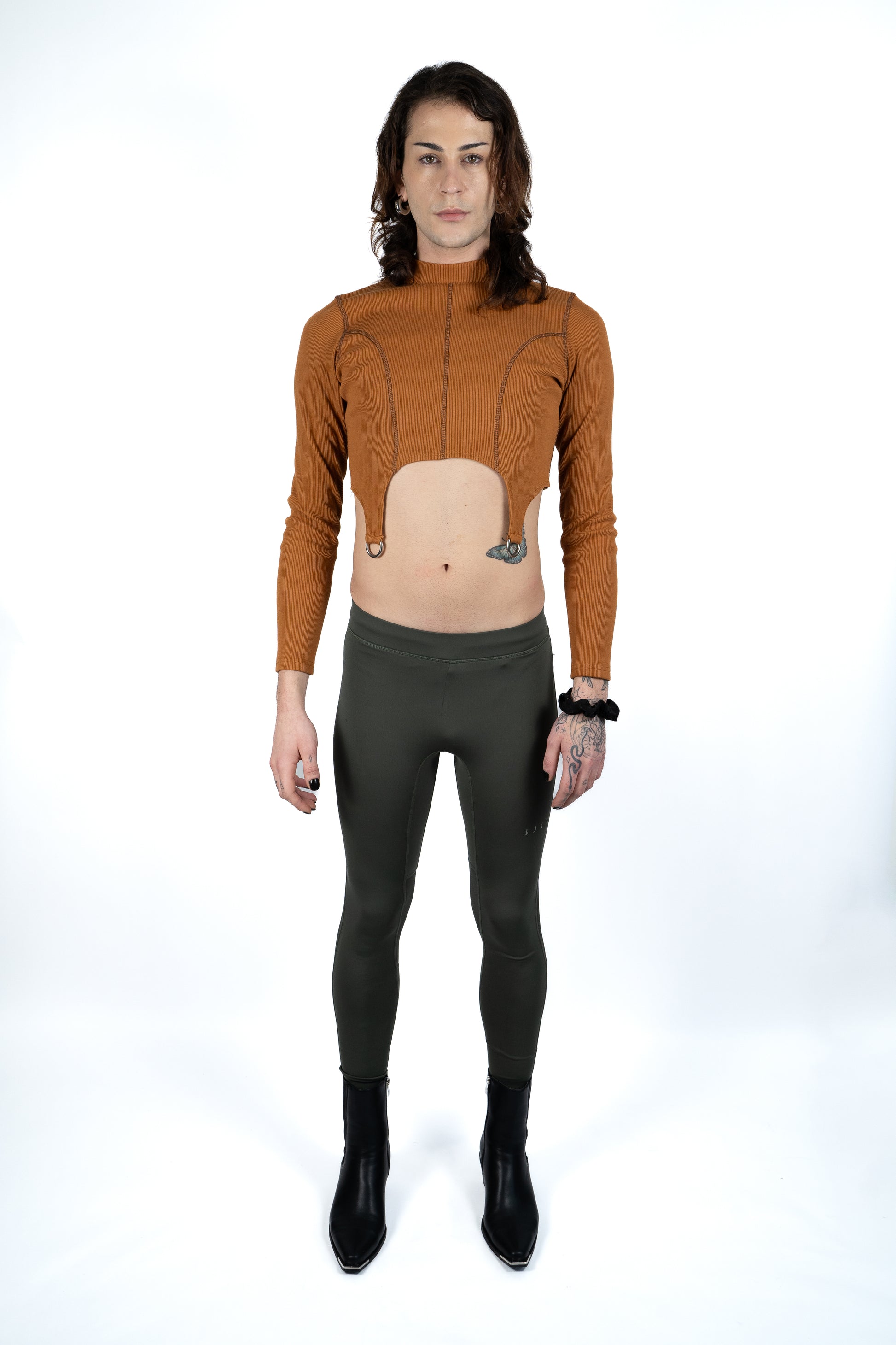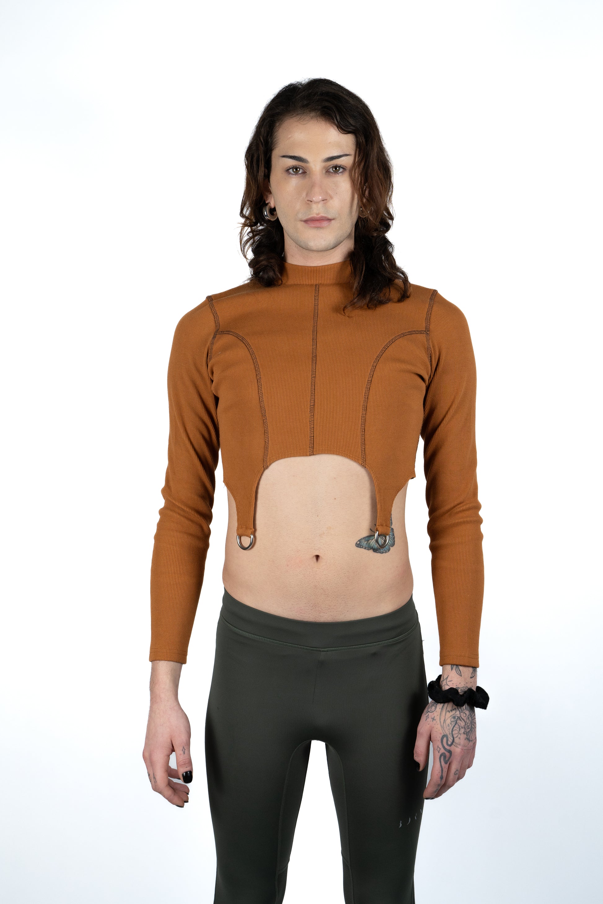 The Ragged Priest’s Distiller Top brings cheeky charm and edgy rebellion to your wardrobe. Crafted from a thicker brown fabric, its form-fitting design flatters your curves, while suspender-like endings add a playful, vintage-inspired twist.