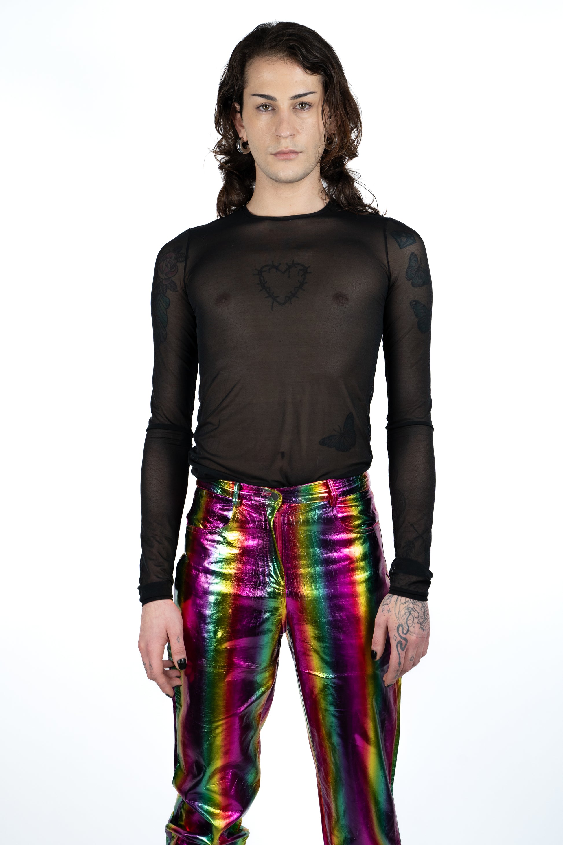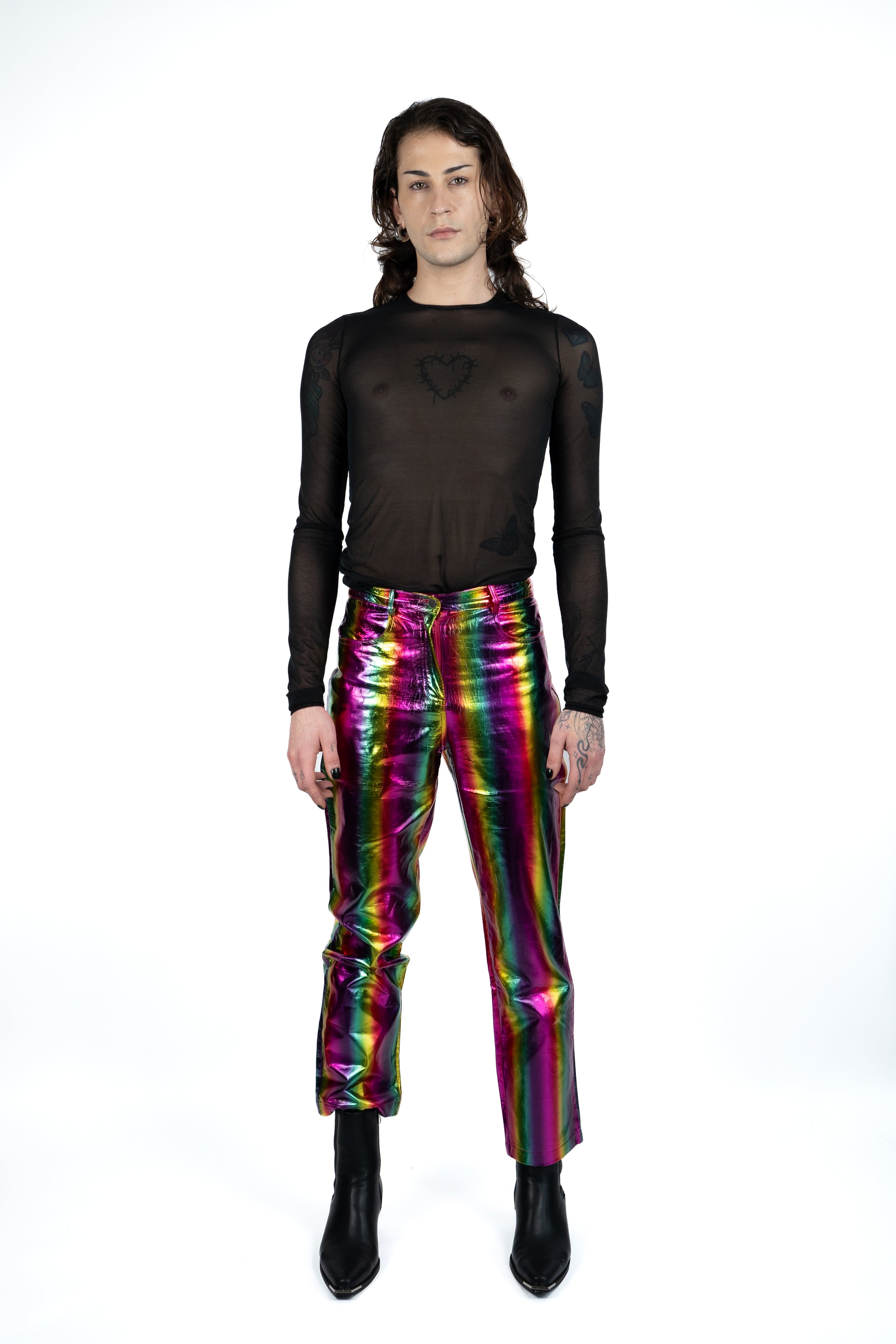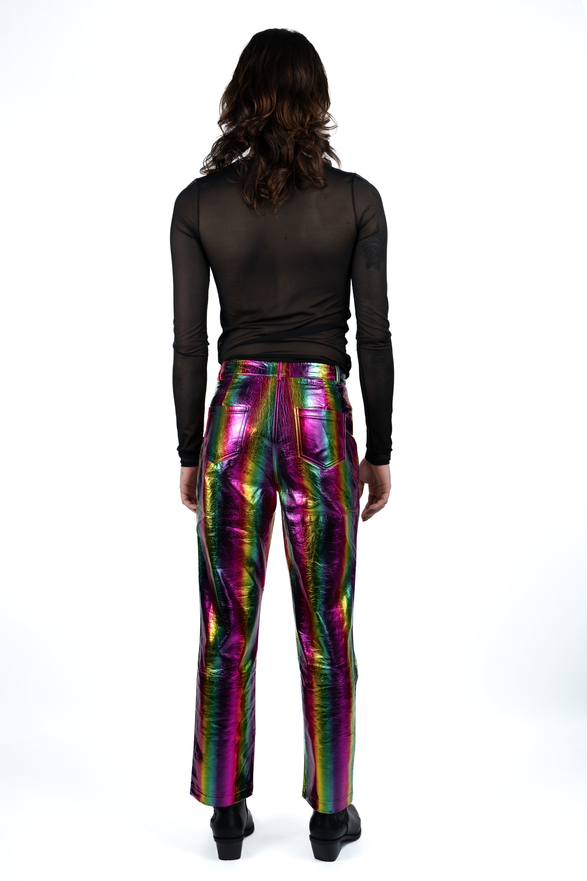 The Metallic Rainbow Pants are a bold celebration of individuality and pride, blending vibrant rainbow hues with a shimmering metallic finish for a standout look. Designed with an oversized fit and true-to-size waist, these wide-cut pants offer both comfort and effortless style.