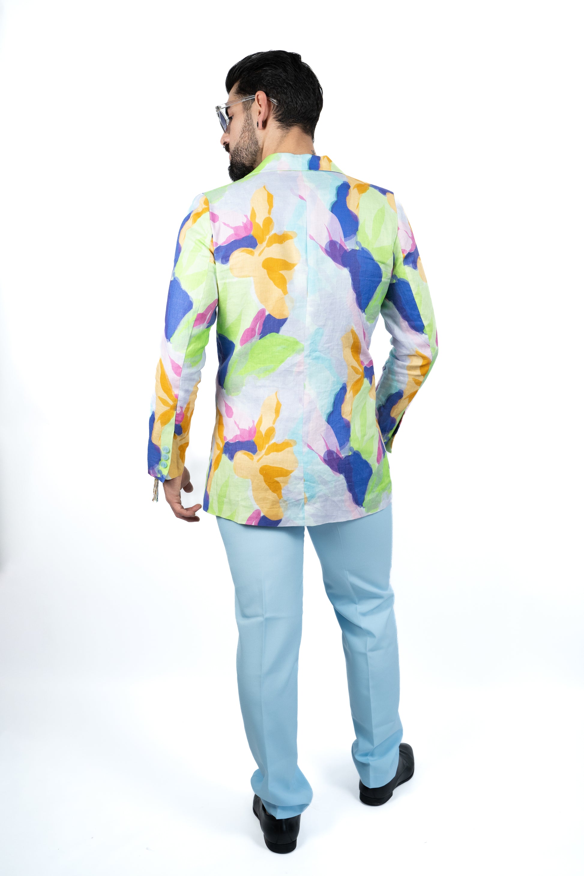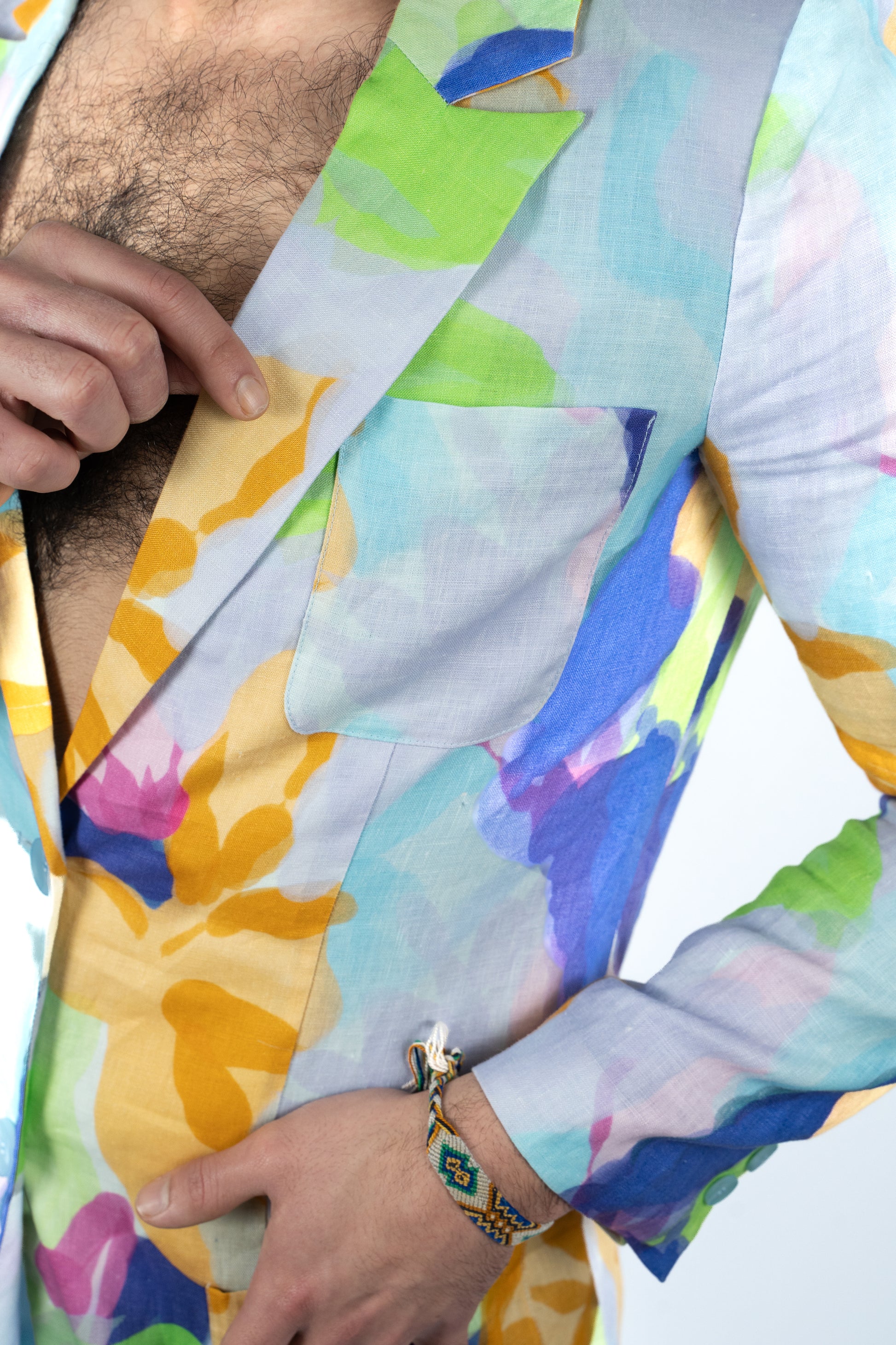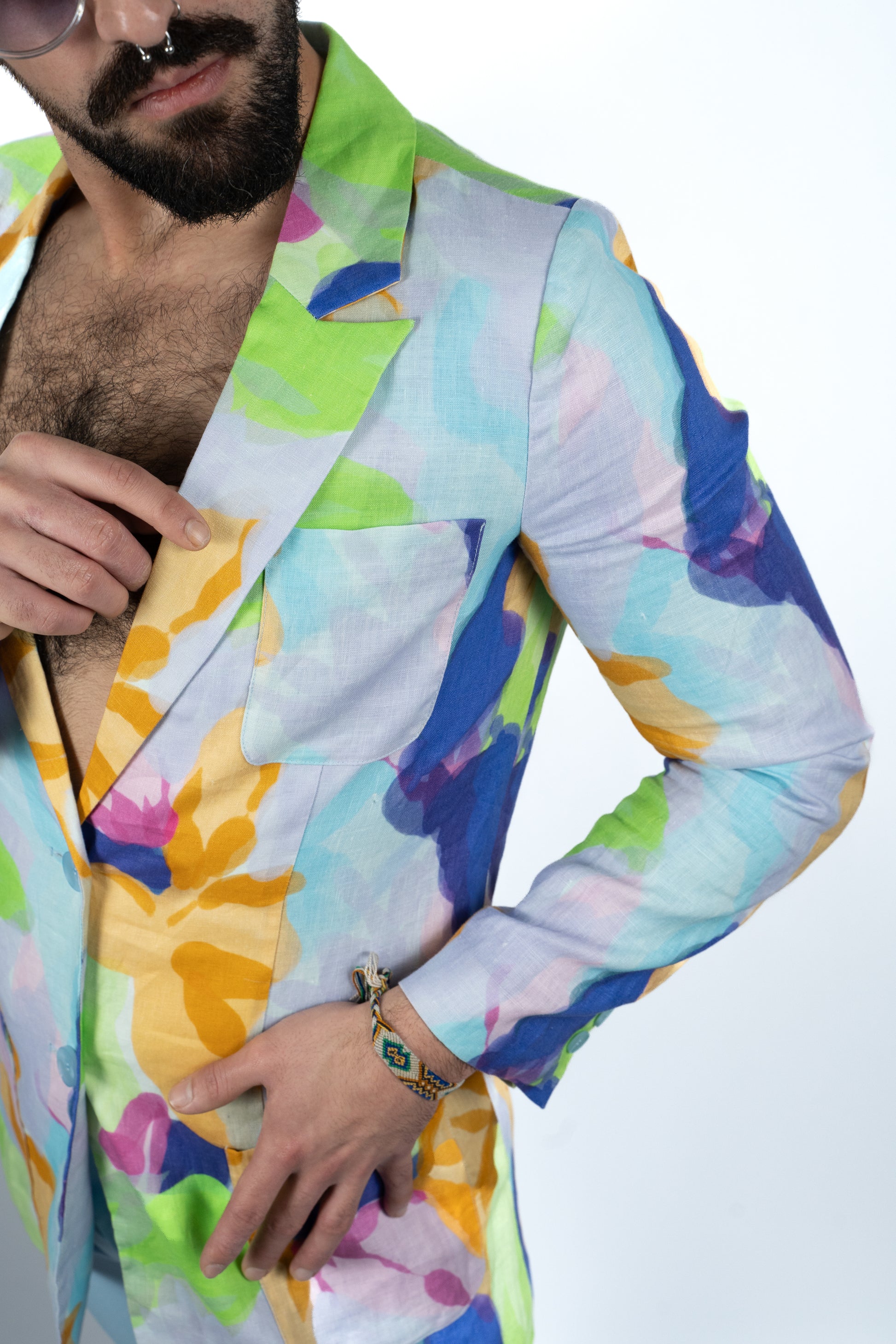 The Mia White full linen suit from Milan is crafted from lightweight, breathable Italian linen, perfect for summer. This elegant white outfit features a tailored top and flowy shorts resembling a skirt, blending sophistication, comfort, and modern style.