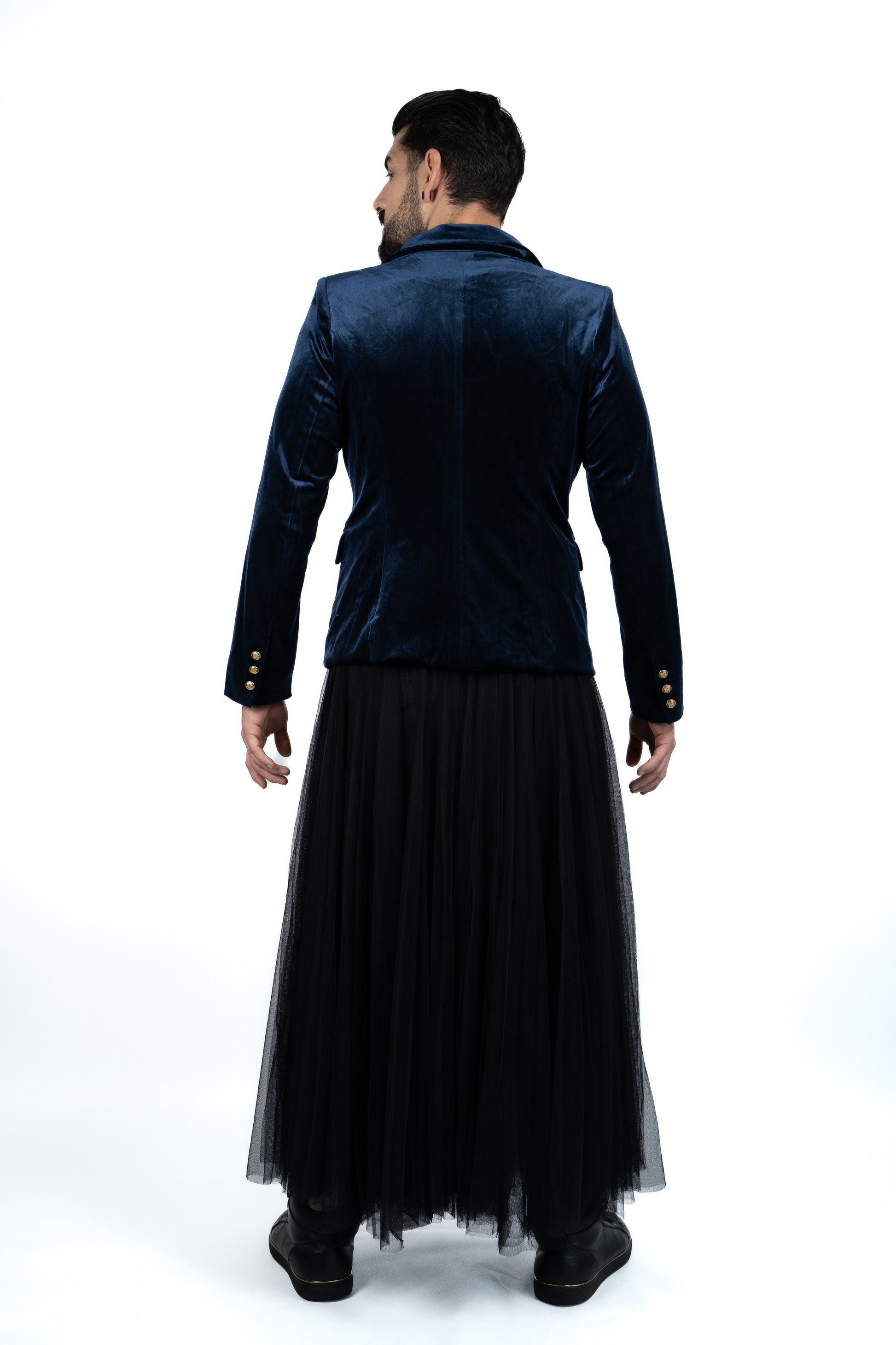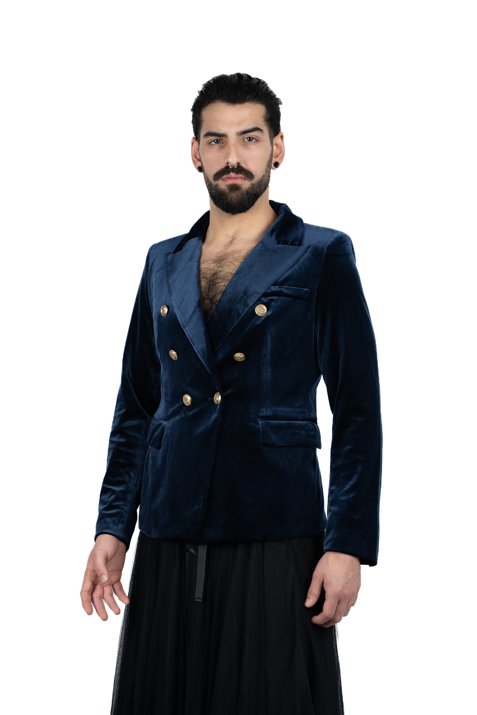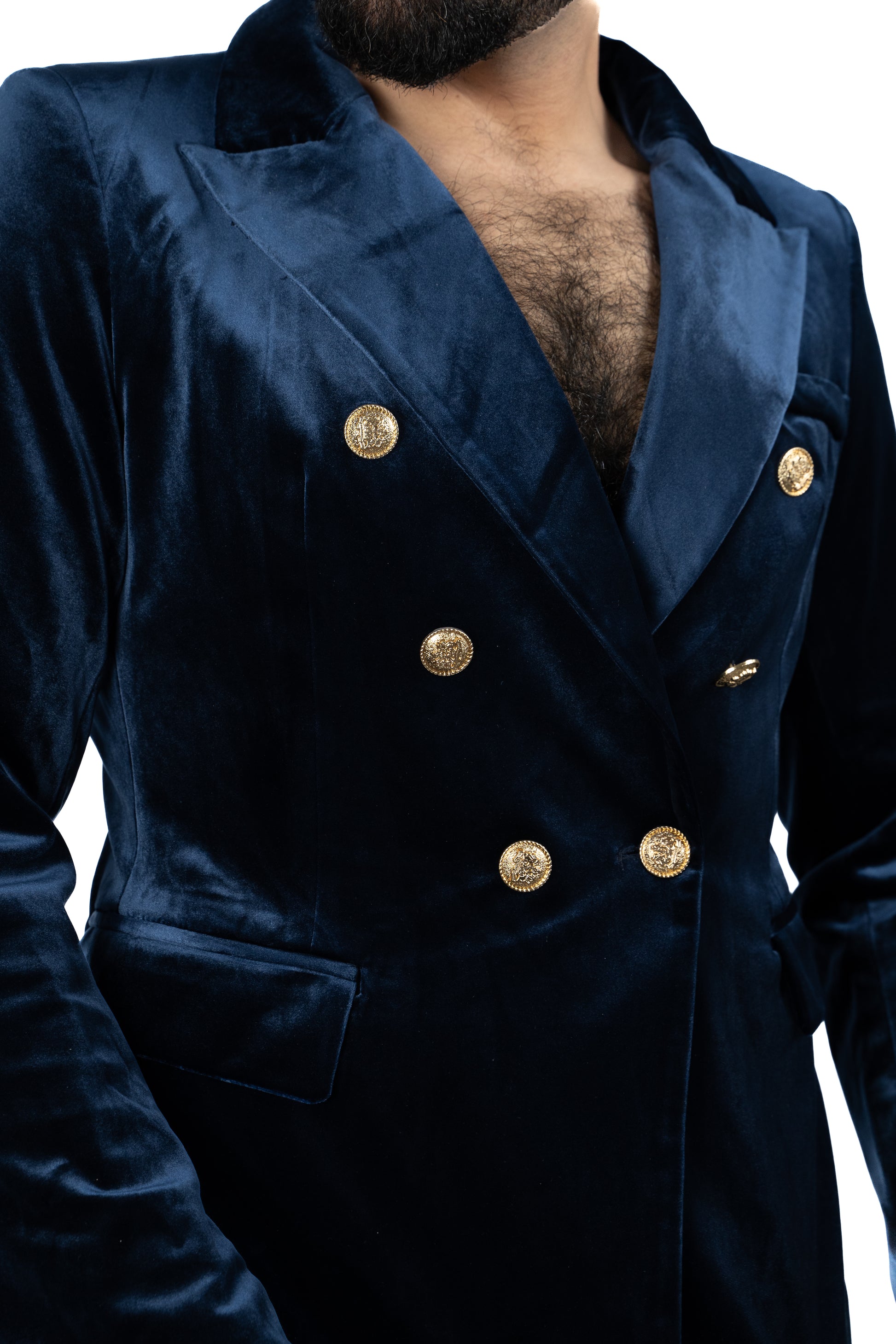 The Navy Blue Velvet Blazer combines luxurious velvet fabric with a rich navy hue and gleaming gold button accents for a timeless, sophisticated look. Its tailored slim silhouette, classic lapel collar, and single-button closure create a polished, refined fit perfect for any occasion.