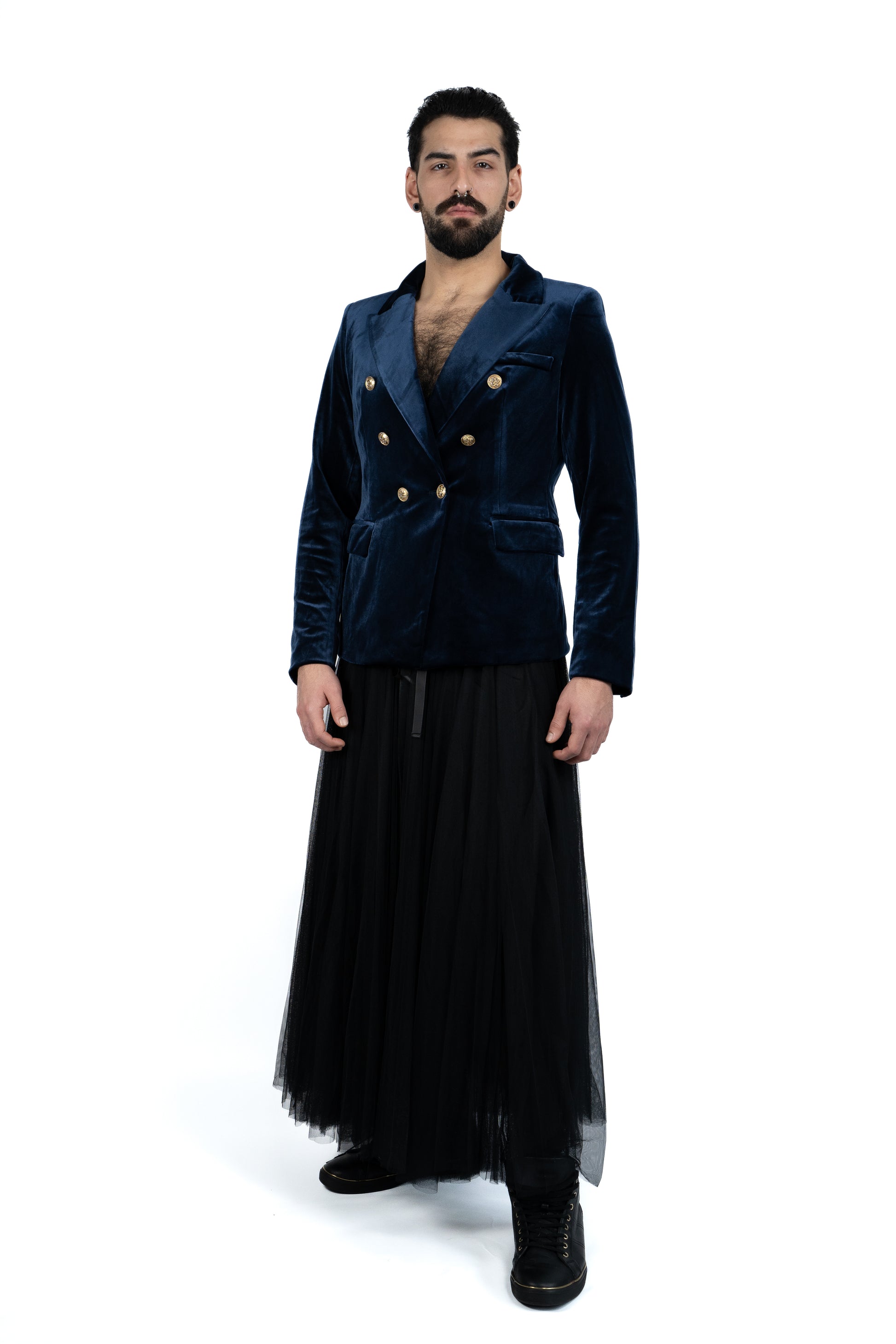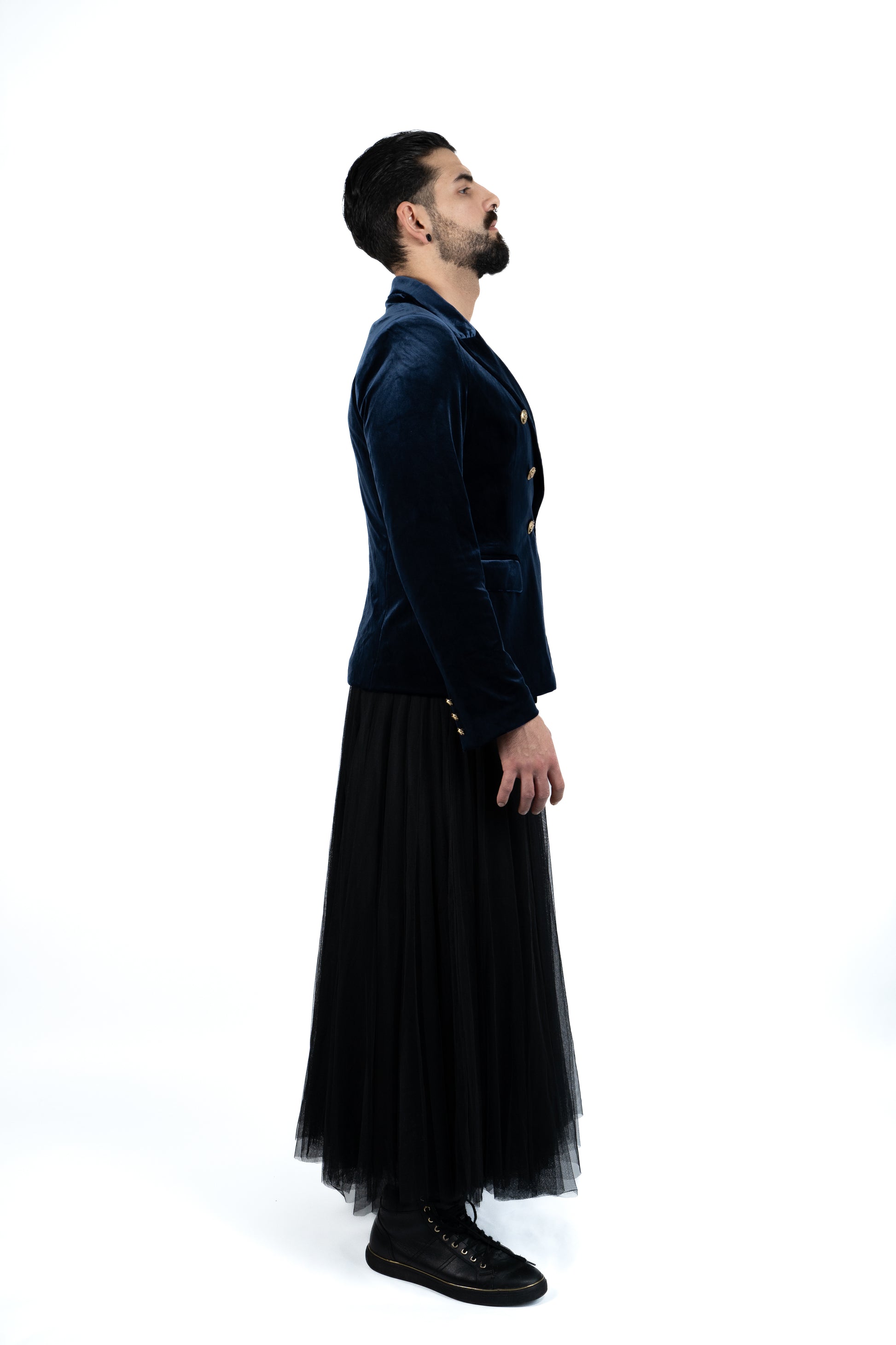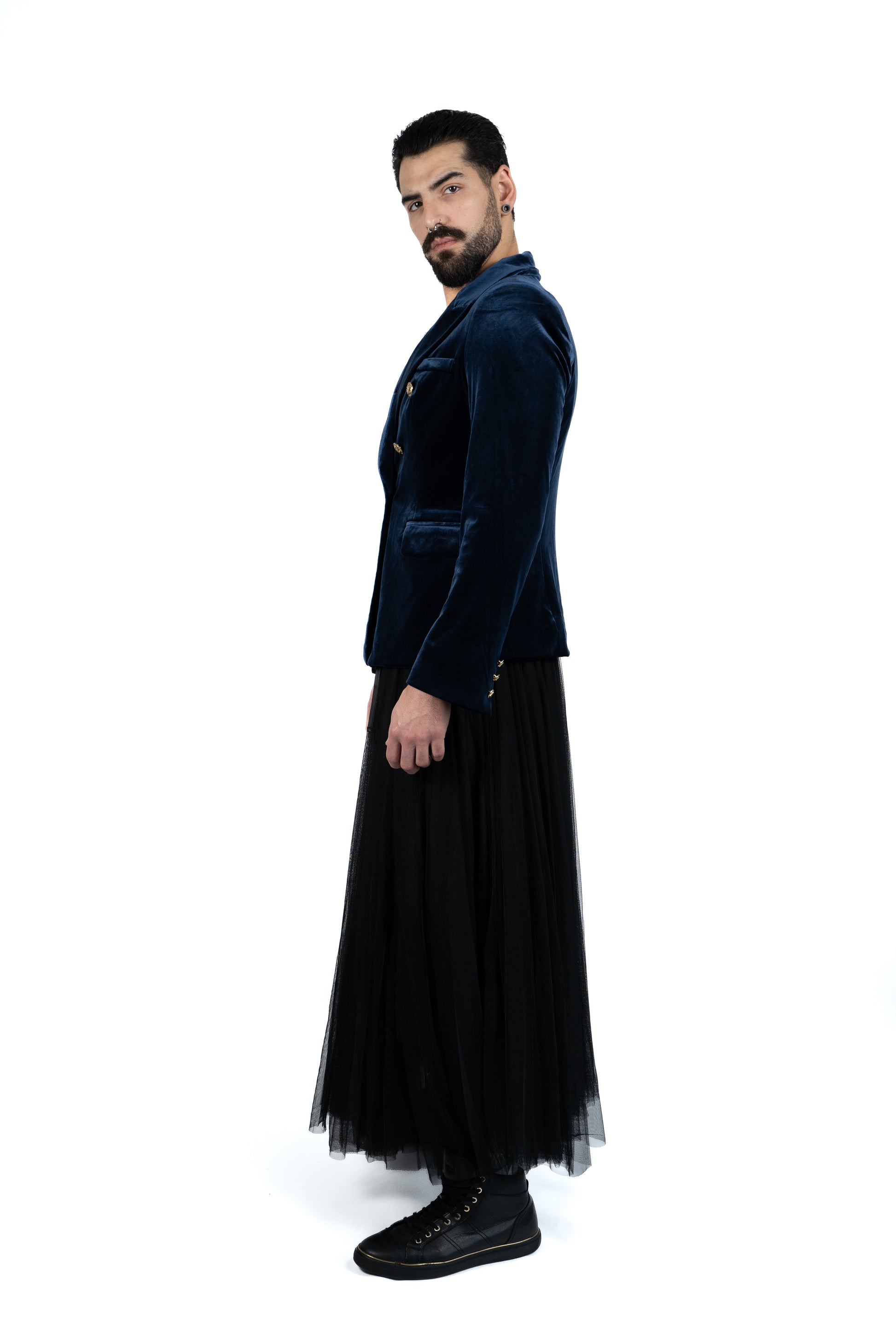 The Navy Blue Velvet Blazer combines luxurious velvet fabric with a rich navy hue and gleaming gold button accents for a timeless, sophisticated look. Its tailored slim silhouette, classic lapel collar, and single-button closure create a polished, refined fit perfect for any occasion.